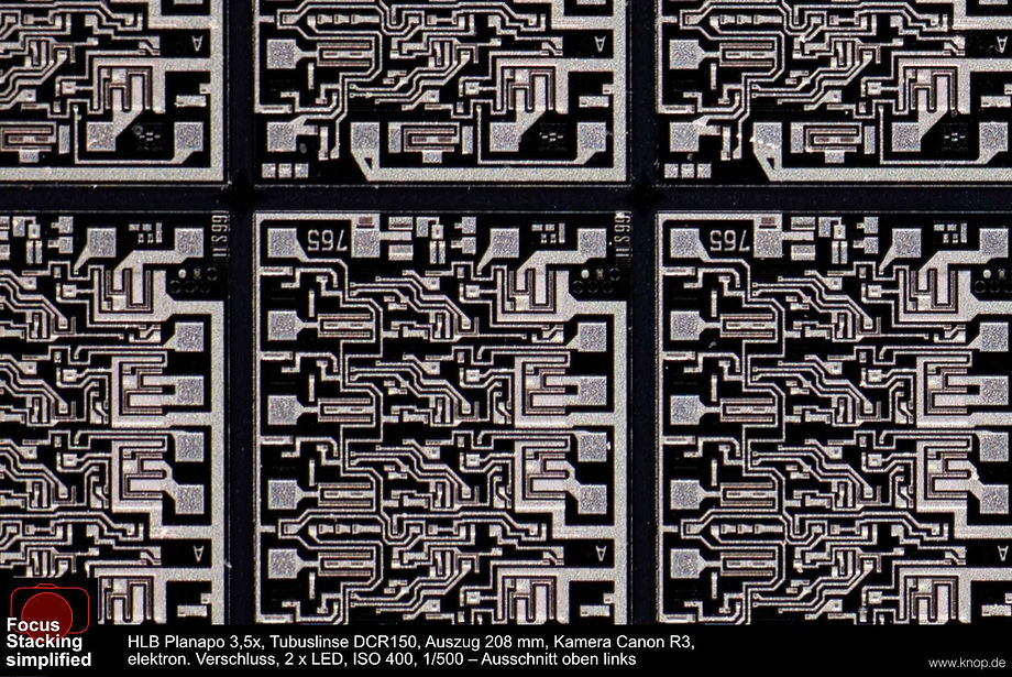 Das Bildfeld des HLB-Objektivs (oben links) zeigt eine insgesamt gleichmäßige und ruhige Abbildungsleistung, gemessen an der moderaten numerischen Apertur von 0,1. In der Zentrumslage (unten links im oberen linken Bild) überzeugt das Objektiv mit klarer Linienführung, guter Trennung feiner Strukturen und einem differenzierten Kontrastverlauf. Auch in der Detailvergrößerung (links unten) bleibt das Bild stabil – die Leiterbahnen sind klar definiert, der Mikrokontrast zurückhaltend, aber sauber.